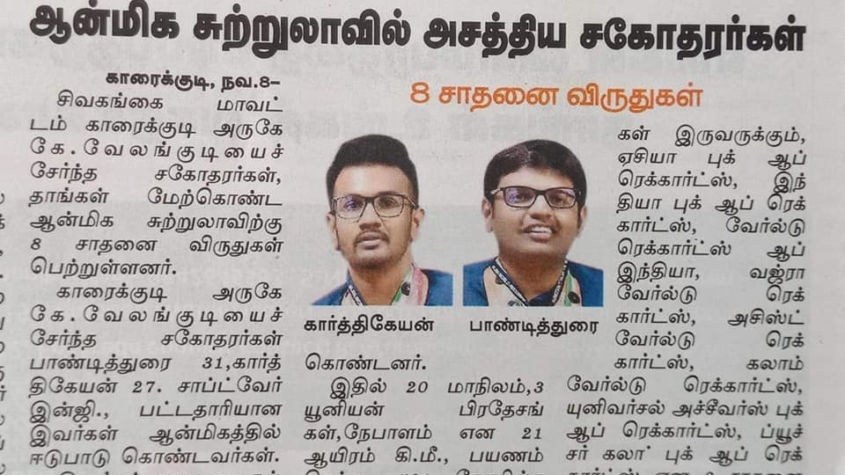 Universal Achievers Book of Records Certify and Honour Mr. PANDIDURAI DURAIRAJ AND Mr. KARTHIKEYAN DURAIRAJ of Karaikudi, Tamil Nadu, India for Creating a World Record of BEING THE FIRST BROTHERS IN THE WORLD TO WORSHIP 501 TEMPLES(ENTERING INSIDE THE TEMPLE AND WORSHIPPED THE GOD’S IDIOL) BY A SELF DRIVEN CAR COVERING A DISTANCE OF 20,822 KMS IN 20 STATES, 3 UNION TERRITORIES IN INDIA AND NEPAL( 2 COUNTRIES) IN 49 DAYS STARTING FROM 11.00 AM, THURSDAY, 7TH NOVEMBER, 2019 AT K. VELANGUDI, KARAIKUDI, TAMIL NADU, INDIA AND ENDING BY 8.00 PM, WEDNESDAY, 25TH DECEMBER, 2019 AT K. VELANGUDI, KARAIKUDI, TAMIL NADU, INDIA.