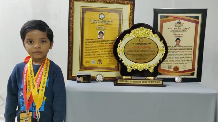 YOUNGEST KID IN THE WORLD TO IDENTIFY MOST COUNTRIES NATIONAL FLAG, IDENTIFY ALL INDIAN STATES WITH CAPITAL AND ARRANGE INDIA AND WORLD MAP PUZZLE IN LEAST TIMEUNIVERSAL ACHIEVERS BOOK OF RECORDS Certify and Honour Master. M.S. DARSHITH, Born on 9th March, 2017 of Chennai, Tamil Nadu, India FOR CREATING A WORLD RECORD OF BEING THE YOUNGEST KID IN THE WORLD TO IDENTIFY 195 COUNTRIES NATIONAL FLAG, IDENTIFY ALL INDIAN STATES WITH CAPITALS IN INDIA MAP AND ARRANGES INDIA MAP AND WORLD MAP PUZZLE IN A RECORD TIME OF 23 MINUTES 30 SECONDS AT HIS YOUNG AGE OF 3 YEARS 11 MONTHS on 23rd January, 2021 in Chennai, Tamil Nadu, India.