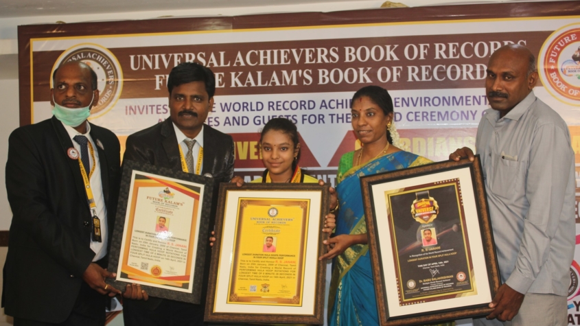 UNIVERSAL ACHIEVERS BOOK OF RECORDS HONOUR R. S. JANANI, BORN ON 25TH JANUARY, 2009 OF CHENNAI, TAMIL NADU, INDIA FOR CREATING A WORLD RECORD OF PERFORMING HULA HOOP ROTATIONS FOR LONGEST TIME OF 6 MINUTE 28 SECONDS IN FOUR SPLIT HULA HOOP ON 14TH APRIL, 2021 IN CHENNAI, TAMIL NADU, INDIA.