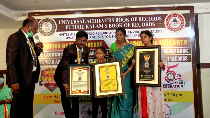 UNIVERSAL ACHIEVERS BOOK OF RECORDS HONOUR A.L. DEEPSHIKKHA, BORN ON 4TH DECEMBER, 2012 OF CHENNAI, TAMIL NADU, INDIA FOR CREATING A WORLD RECORD OF PERFORMING 167 HULA HOOP ROTATIONS IN WAIST WHILE SPINNING 3 HULA HOOPS WITHOUT SPLITTING IN ONE MINUTE ON 14TH APRIL, 2021 IN CHENNAI, TAMIL NADU, INDIA