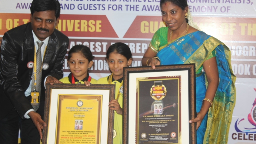 UNIVERSAL ACHIEVERS BOOK OF RECORDS HONOUR S.N. JANANI SHREE & S.N JAANAVI, OF CHENNAI, TAMIL NADU, INDIA FOR CREATING A WORLD RECORD OF BEING THE FIRST TWIN SISTERS IN THE WORLD TO PERFORM 95 HULA HOOP ROTATIONS IN ONE MINUTE ON 14TH APRIL, 2021 IN CHENNAI, TAMIL NADU, INDIA.