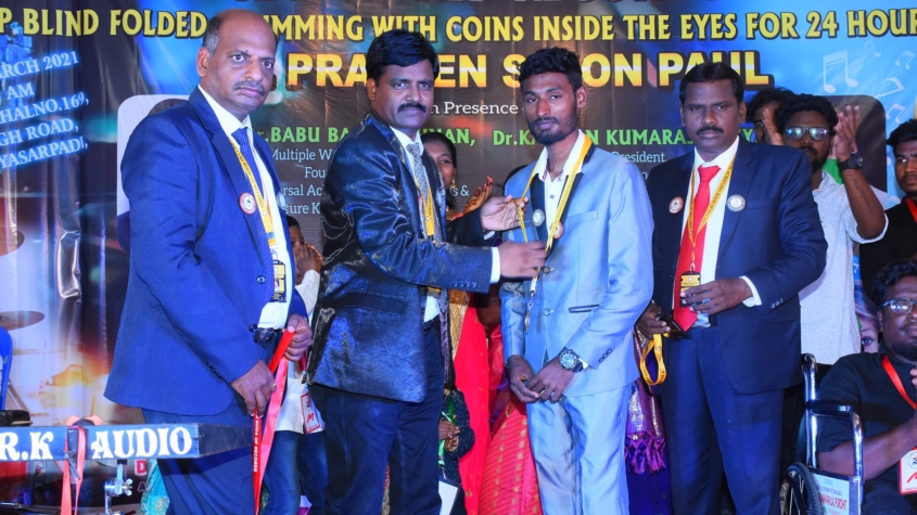 UNIVERSAL ACHIEVERS BOOK OF RECORDS Certify and Honour PRAVEEN SIMON PAUL. B, Chennai, Tamil Nadu, India For Creating A World Record of NON STOP BLIND FOLDED DRUMMING WITH COINS IN THE EYE FOR 24 HOURS STARTING FROM 27TH MARCH, 2021 12.05 PM TO 28TH MARCH, 2021 12. 05 PM at Mysore Mahal, Chennai, Tamil Nadu, India.