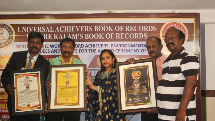 UNIVERSAL ACHIEVERS BOOK OF RECORDS Honour J. UMANATH @ PASUMAI NAYAGAN For Creating A World Record of BEING THE FIRST ENVIRONMENTALIST TO INTRODUCE AN INFORMATION DIRECTORY ON NATURAL FARMING, TO PLANT AROUND 10 LAKH 10 THOUSAND TREES, CREATE 1528 ROOF GARDEN’S IN CHENNAI, DID 1200 RAIN WATER HARVESTING IN OPEN WELLS IN HARD ROCKY REGION IN VELLORE DISTRICT, ORGANIZED VARIOUS CONTINUOUS ENVIRONMENTAL AWARENESS PROGRAM ON SEEDS COLLECTION, AIRCRAFTING, SOIL ENRICHMENT, NO PLASTIC, NAUTURAL FARMING TECHNIQUES INCLUDING 160 DAYS RALLY IN TEMPO TRAVELLER ACROSS TAMIL NADU AND 15 DAYS CYCLE RALLY ACROSS CHENNAI AS AN INDIVIDUAL.