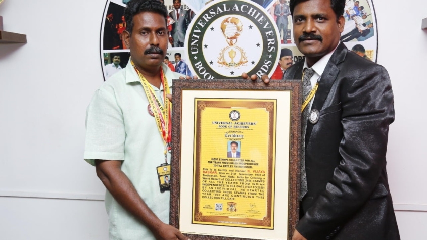 Universal Achievers Book of Records Certify and Honour K. VIJAYA BASKAR, Born on 21st November, 1978 of Tindivanam, Tamil Nadu, India for Creating a World Record of COLLECTING 2456 STAMPS OF ALL THE YEARS FROM INDIAN INDEPENDENCE TO TILL DATE (1947 TO 2020) BY AN INDIVIDUAL. HE STARTED COLLECTING THESE STAMPS FROM THE YEAR 1997 AND CONTINUING THIS COLLECTION TILL DATE.