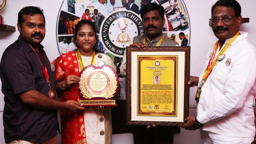 Universal Achievers Book of Records Certify and Honour Mrs. S.K. SANDHYA & Mrs. S.K. JYOTHEE, Born on 10th October, 1984 & 23rd August, 1991 respectively of Chennai, Tamil Nadu, India for Creating a World Record of BEING THE FIRST SISTERS IN THE WORLD TO RUN A HIGHLY SOPHISTICATED AND INTERNATIONAL STANDARD AMBULANCE SERVICE AND FUNERAL CARE SUCCESSFULLY FOR THE PAST 10 YEARS AND SAVED AROUND 50,000 LIVES, INCLUDING 1000 INFANTS AND SERVED AROUND 75,000 PATIENTS INCLUDING 2500 COVID 19 AFFECTED PATIENTS ACROSS INDIA.