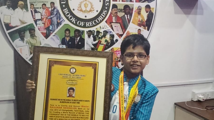 Universal Achievers Book of Records Certify and Honour Master. RAGURAM RAGHULAN, Born on 1st July, 2013 of Chengalpattu, Tamil Nadu, India for Creating a World Record of BEING THE YOUNGEST KID IN THE WORLD TO RECITE 1000 Pi DIGITS BLINDFOLDED IN A RECORD TIME OF 6 MINUTES 22 SECONDS on 25.06. 2021 in Chengalpattu, Tamil Nadu, India.