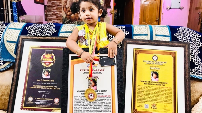 Universal Achievers Book of Records Certify and Honour Baby. D.GAGANA SRI, Born on 25th May, 2019 of Chennai, Tamil Nadu, India for Creating a World Record of BEING THE YOUNGEST KID IN THE WORLD TO IDENTIFY 42 COUNTRIES FLAGS, 42 FLOWERS, TWO LETTER WORDS 20, THREE LETTER WORDS 85, 42 FAMOUS PERSONALITIES, 42 SOLAR SYSTEMS, 20 ANIMALS AND THEIR BABIES NAMES, 42 SEA CREATURES, 42 OBJECTS WITH PHONETICS SOUND, 42 COMMUNITY HELPERS, 22 NATURAL DISASTERS, 12 CLIMATIC CONDITIONS, 42 INSECTS, 28 SCIENTISTS AND THEIR INVENTIONS AND 24 FREEDOM FIGHTERS NAME IN JUST 20 MINUTES as confirmed on 5th July, 2021.