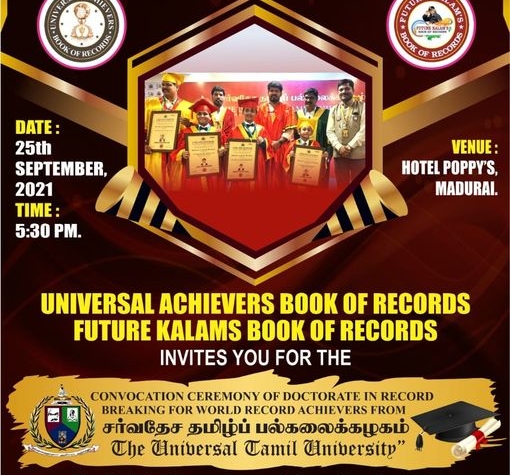 ARE YOU A WORLD RECORD ACHIEVER??? ARE YOU INTERESTED TO GET THE HONORARY DEGREE OF DOCTORATE IN RECORD-BREAKING FOR YOUR WORLD RECORD ACHIEVEMENT??? UNIVERSAL ACHIEVERS BOOK OF RECORDS AND FUTURE KALAMS BOOK OF RECORDSINVITES YOU FOR THE CONVOCATION CEREMONY OF DOCTORATE IN RECORD-BREAKING FOR YOUR WORLD RECORD ACHIEVEMENT FROM THE UNIVERSAL TAMIL UNIVERSITY.DATE: 25th September 2021.TIME: 5.30 PM.VENUE: HOTEL POPPY’S, MADURAI.For Registration and more information Contact:UNIVERSAL ACHIEVERS BOOK OF RECORDS+91 95000 83738 / +91 95000 72426 / +91 89393 40111