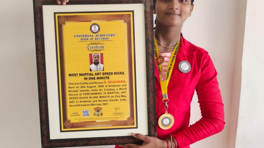 Universal Achievers Book of Records Certify and Honour S.SHAHANA, BORN ON 26TH AUGUST, 2008 FOR CREATING A WORLD RECORD OF PERFORMING 78 MARTIAL ART SPEED KICKS IN ONE MINUTE ON 23RD MAY, 2021 IN ANDAMAN AND NICOBAR ISLANDS, INDIA
