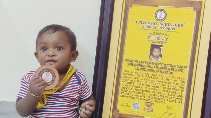 UNIVERSAL ACHIEVERS BOOK OF RECORDS CERTIFY AND HONOUR NAVANEETHA RAAJAA S BORN ON 10TH JANUARY, 2021 OF Chennai, Tamil Nadu, India for Creating a World Record of BEING THE YOUNGEST KID IN THE WORLD TO IDENTIFY 80 FLASH CARDS OF FRUITS, VEGETABLES, ANIMALS, TRANSPORT, PARTS OF BODY AND HOME APPLIANCES IN 16 MINUTES 24 SECONDS AT HIS YOUNG AGE OF 9 MONTHS 9 DAYS, AS CONFIRMED ON 19TH OCTOBER, 2021.