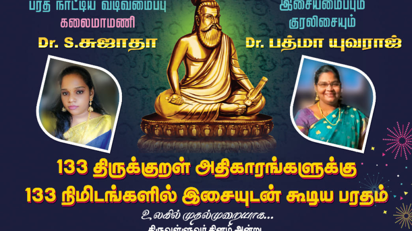 “WORLD’S FIRST DANCE AND MUSIC TEAM TO COMPOSE MUSIC, SONGS, DANCE CHOREOGRAPHY AND PERFORM BHARATHANATYAM DANCE WITH MUSIC FOR ALL THE 133 CHAPTERS OF THIRUKKURAL IN A RECORD TIME OF 133 MINUTES” We appreciate and Congratulate all the Dance Students and the Music team for joining this Unique World Record initiative…Our heartfelt advanced wishes for making this Record Attempt a grand success…
