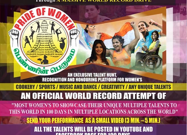 As a mark of Respect and Honour to our Respected WOMEN’S we are happy and proud to launch a Massive World Record Campaign titled PRIDE OF WOMEN…PRIDE OF WOMEN is a Unique Mass World Record Initiative to PROMOTE THE PRIDE OF WOMEN, RECOGNIZE AND HONOUR THE WOMEN ACHIEVERS AND TO SHOWCASE THE HIDDEN TALENTS OF A WOMEN TO THIS WORLD…We invite all the WOMEN’S to utilize this GOLDEN Opportunity and Showcase your unique talents to this world…For Registration and more information:Dr. BABU BALAKRISHNAN,Multiple World Record Achiever…+91 9500083738 / +91 95000 72426E. Mail: prideofwomen2022@gmail.com
