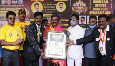 Universal Achievers Book of Records Certify and Honour TAMIL NADU SILAMBAM MARTIAL ARTS ASSOCIATION AND INDIAN YOUTH SPORTS ASSOCIATION for Creating a MASS WORLD RECORD OF 3100 SPORTS PERSON’S TO PERFORM VARIOUS SPORTS ACTIVITIES BY WEARING THE FACE MASK OF SPORTS LEGEND MAJOR DHYAN CHAND FOR 2021 SECONDS IN MULTIPLE…