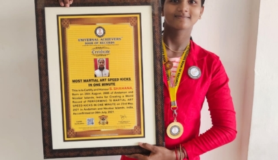 Universal Achievers Book of Records Certify and Honour S.SHAHANA, BORN ON 26TH AUGUST, 2008 FOR CREATING A WORLD RECORD OF PERFORMING 78 MARTIAL ART SPEED KICKS IN ONE MINUTE ON 23RD MAY, 2021 IN ANDAMAN AND NICOBAR ISLANDS, INDIA