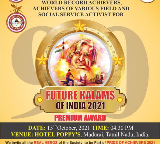 UNIVERSAL ACHIEVERS BOOK OF RECORDS, FUTURE KALAMS BOOK OF RECORDS AND THE UNIVERSAL TAMIL University Invites all the WORLD RECORD ACHIEVERS, ACHIEVERS OF VARIOUS FIELDS AND SOCIAL SERVICE ACTIVISTS FOR-WORLD RECORD FEST 2021 An Exclusive Platform to Showcase your Extraordinary Talents to this World.TALENT HUNT PLATFORM / AWARD CEREMONY / CONVOCATION CEREMONY OF DOCTORATE IN RECORD BREAKING DATE: 13th & 14th November, 2021.VENUE:GOLDAN PARKS INN, KODAIKKANAL, TAMIL NADU.For Registration and Enquiry Contact:UNIVERSAL ACHIEVERS BOOK OF RECORDS+91 95000 83738 / +91 95000 72426 / +91 89393 40111