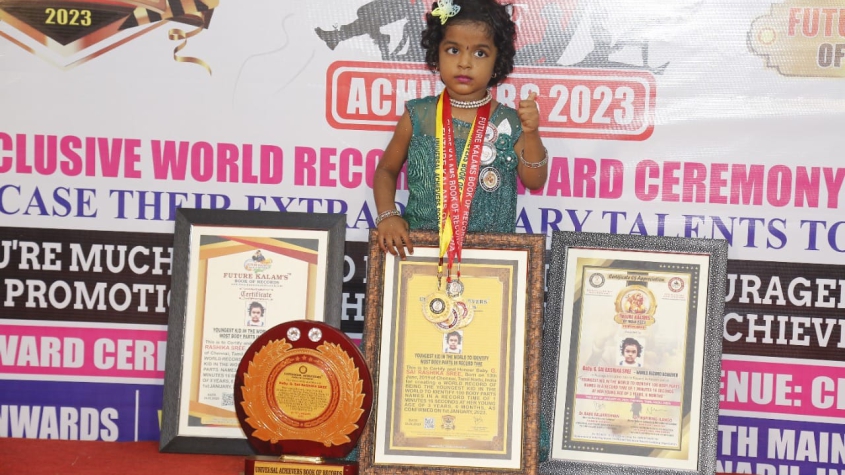 UNIVERSAL ACHIEVERS BOOK OF RECORDS Certify and Honour Baby. G. SAI RASHIKA SREE, Born on 13th June, 2019 of Chennai, Tamil Nadu, India for creating a WORLD RECORD OF BEING THE YOUNGEST KID IN THE WORLD TO IDENTIFY 100 BODY PARTS NAMES IN A RECORD TIME OF 1 MINUTES 16 SECONDS AT HER YOUNG AGE OF 3 YEARS, 6 MONTHS, AS CONFIRMED ON 1st JANUARY, 2023.